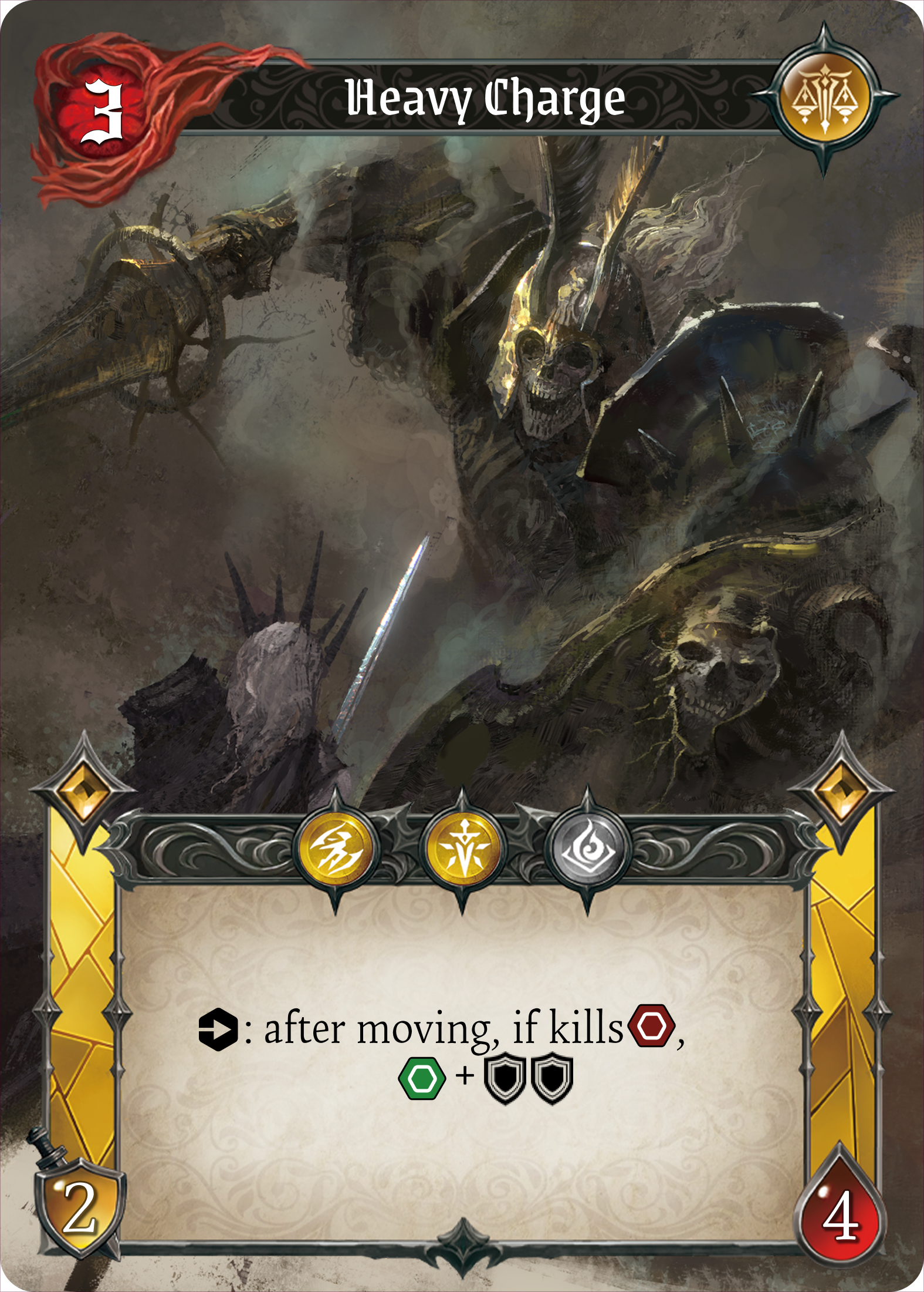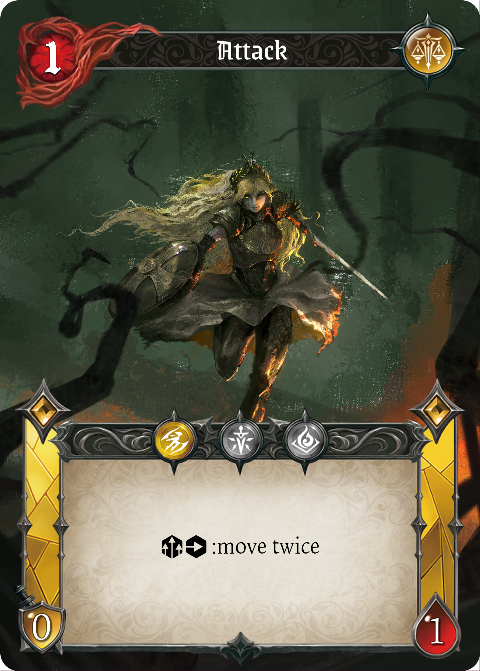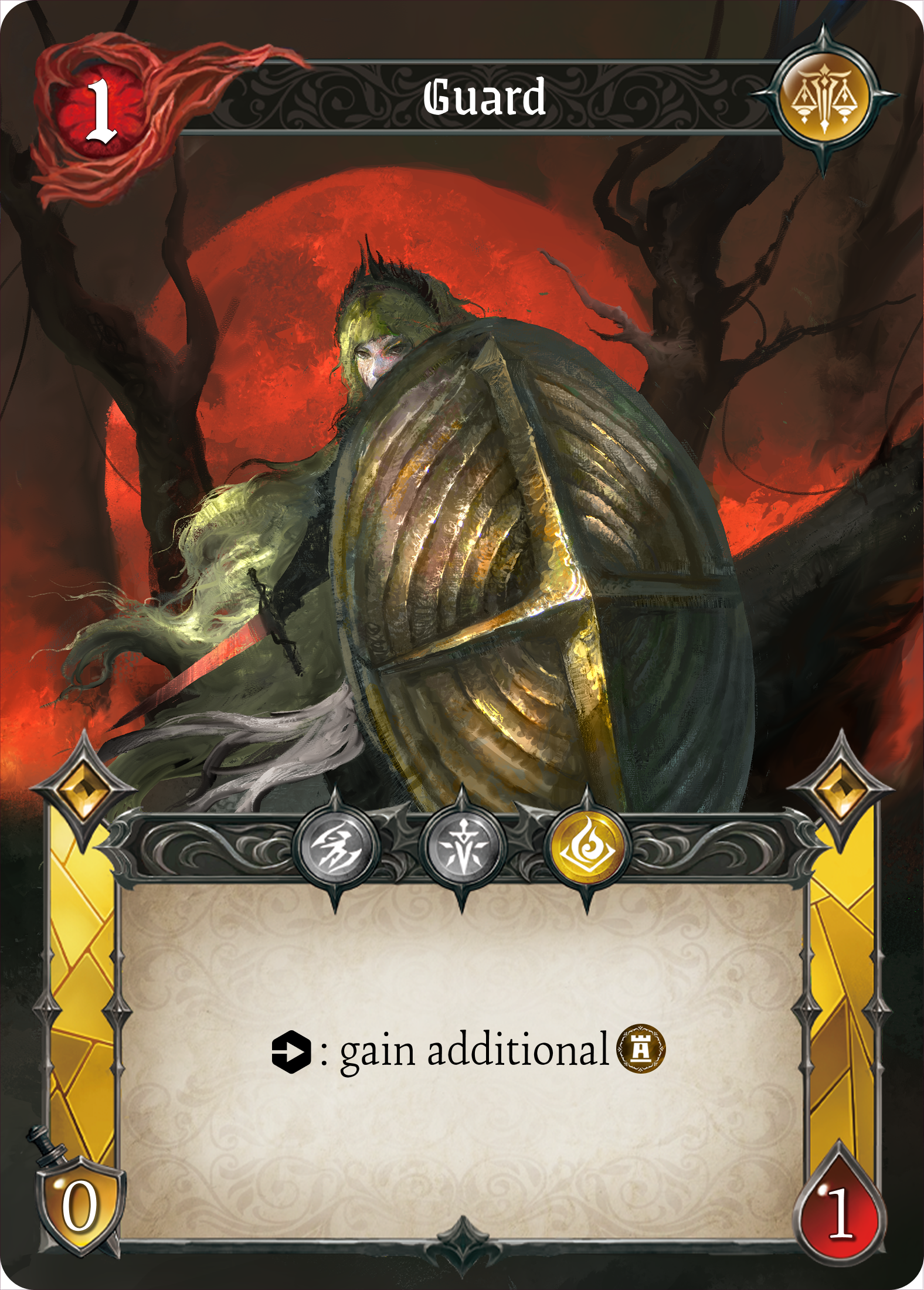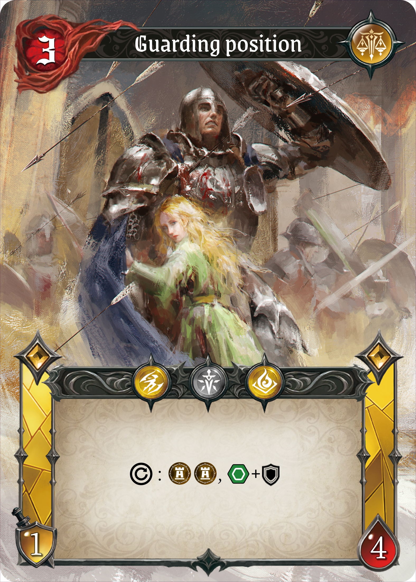 She raises her shield, guarding herself and her allies, bearing every blow without retreat.